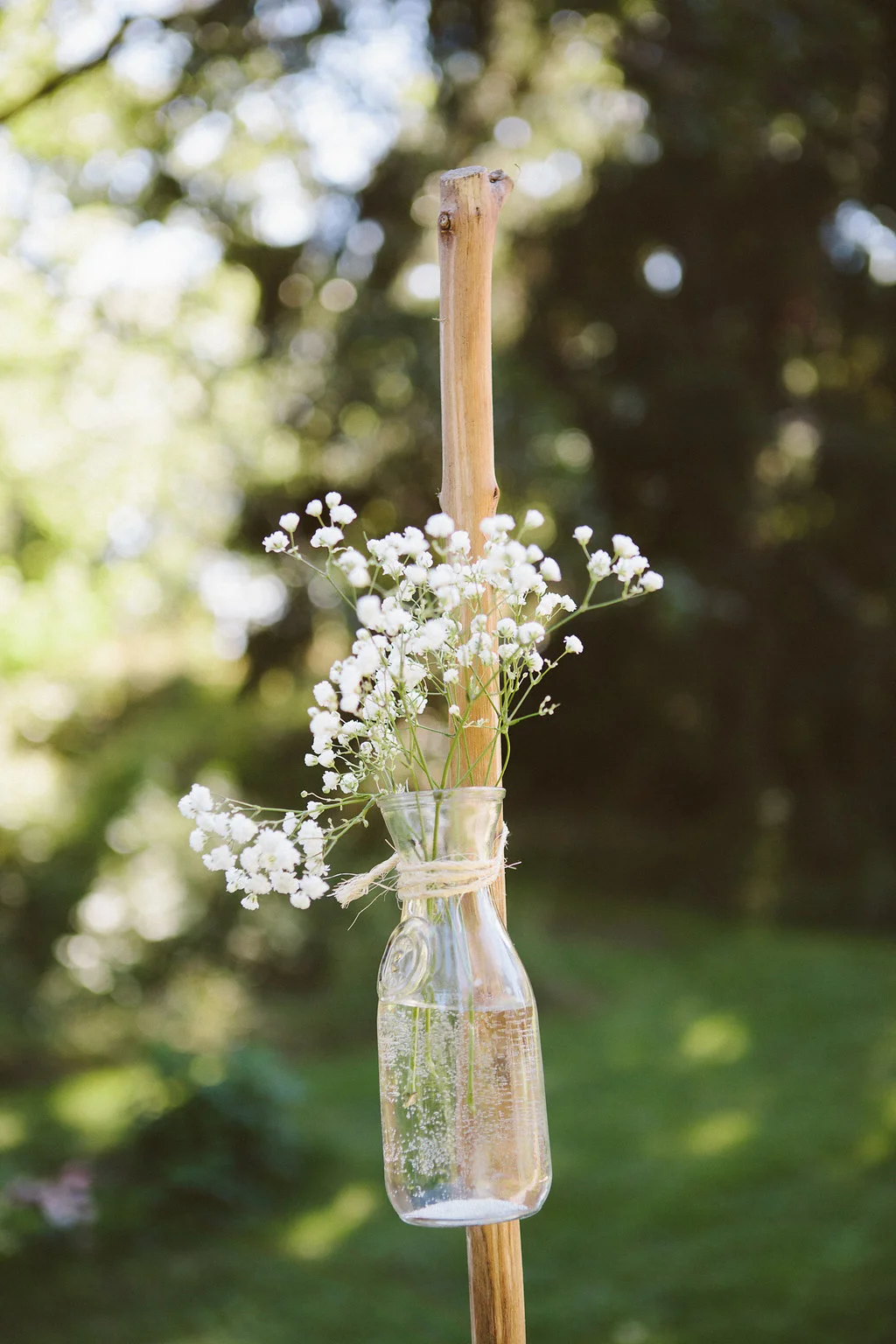 “Martins mormors fina gamla trasmattor fick agera altargång och Veronicas extra-Mamma Catharina dekorerade stolsraderna, som bestod av udda stolar vi samlat ihop från Kollot vi befann oss på, med loppisfyndade glasflaskor med brudslöjor i. Altarbågen bestod av ett par fina gamla stockar som även dessa kläddes in med brudslöjor och skirt tyg. Vi hade ägnat sommaren åt att samla in dekorationer från vänner och släktingars vindsförråd, källarutrymmen och trädgårdar och la inte ner många kronor alls på att få det precis så avslappnat och härligt vi tänkt oss.”