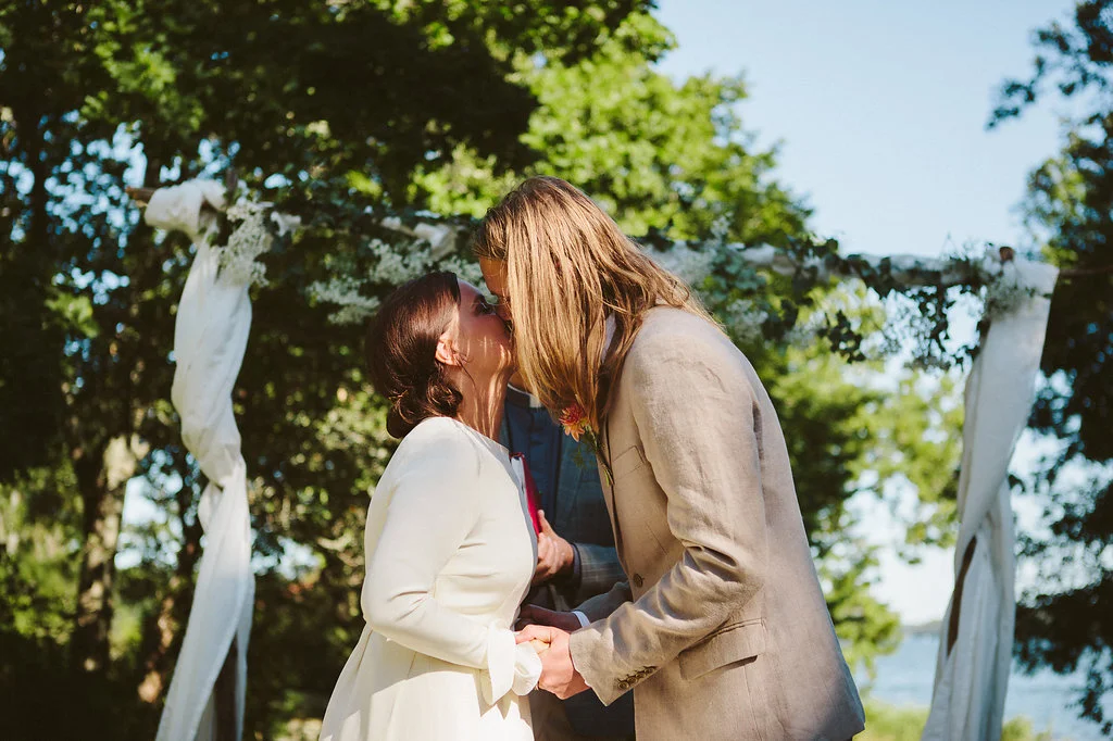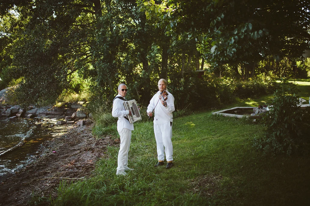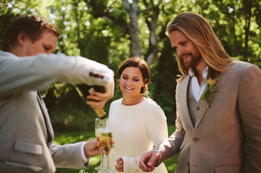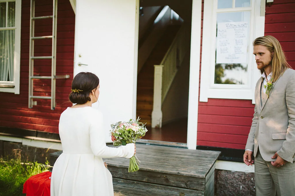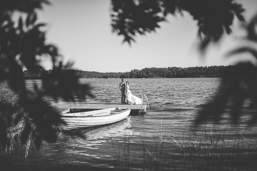 “Vigseln följdes av mingel vid bryggan för gästerna och en fotosession för oss. Emma, vår fotograf visste att vi inte ville spendera för mycket tid på just detta, vilket vi diskuterat vid provfotografering några veckor tidigare och att vi ville ha en avslappnad och naturlig känsla på bilderna. Vi ville hellre fokusera på mötena mellan oss och gästerna. I efterhand är vi glada att Emma övertalade oss till den här stunden, bara vi, i lugn och ro. Vi kunde hämta andan från det vi precis varit med om. Herregud - Vi hade liksom gift oss! Och alla vi känner stod där borta och väntade på oss!”