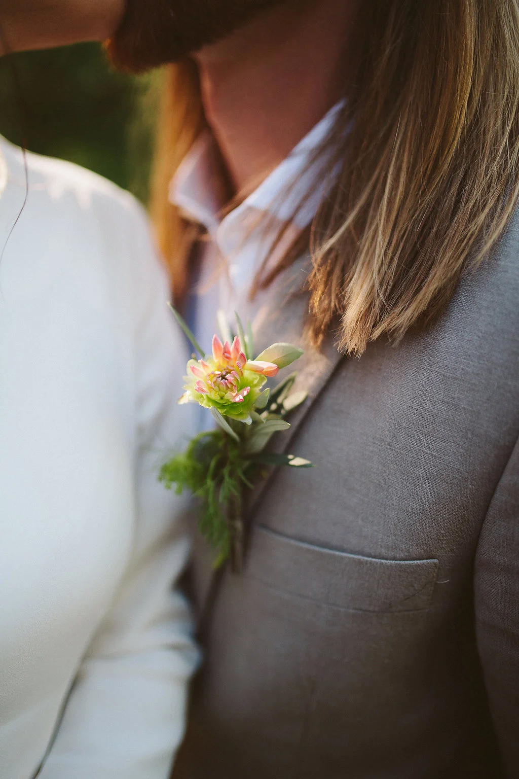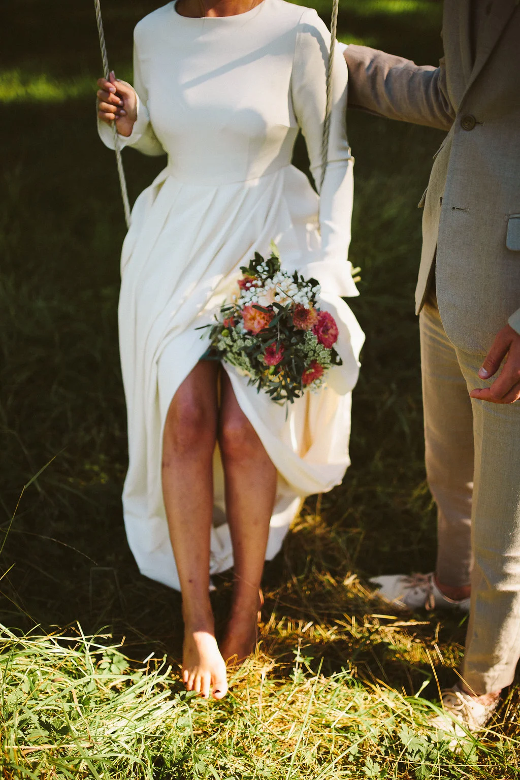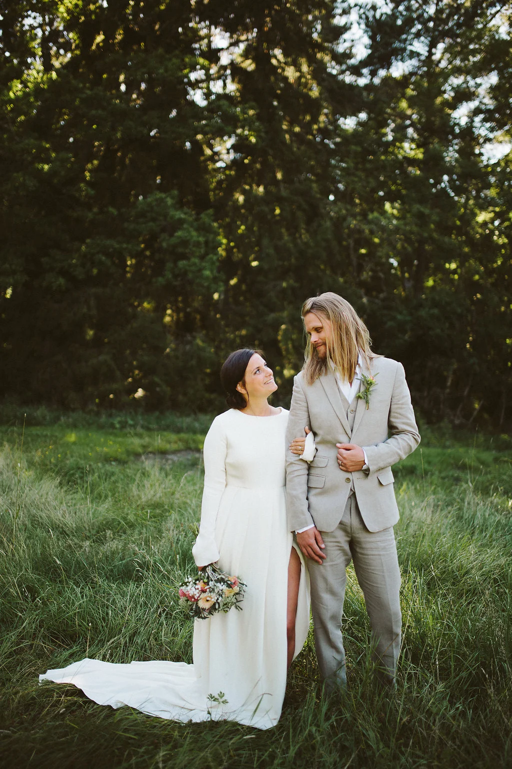 “Vigseln följdes av mingel vid bryggan för gästerna och en fotosession för oss. Emma, vår fotograf visste att vi inte ville spendera för mycket tid på just detta, vilket vi diskuterat vid provfotografering några veckor tidigare och att vi ville ha en avslappnad och naturlig känsla på bilderna. Vi ville hellre fokusera på mötena mellan oss och gästerna. I efterhand är vi glada att Emma övertalade oss till den här stunden, bara vi, i lugn och ro. Vi kunde hämta andan från det vi precis varit med om. Herregud - Vi hade liksom gift oss! Och alla vi känner stod där borta och väntade på oss!”