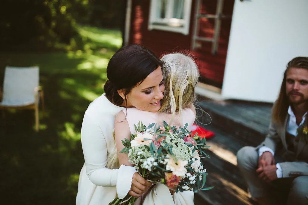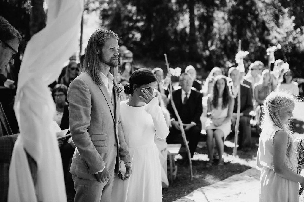 “Vi hade 80 gäster på vårt bröllop och när Maya Ekström och Moa Sone sjöng “Evighet” med Thomas Andersson Wij och Ted Gärdestads “För kärlekens skull” under vigseln var inte ett öga torrt. Det här är något vi inte tänkte på under själva ceremonin, vi var så fokuserade på varandra, som i en liten bubbla, allt det som skedde bakom oss bland våra gäster har vi fått återberättat i efterhand eller sett på fotografierna. Det värmer otroligt när vi ser hur våra vänners glädje lyser igenom bilderna från den här helgen. ”