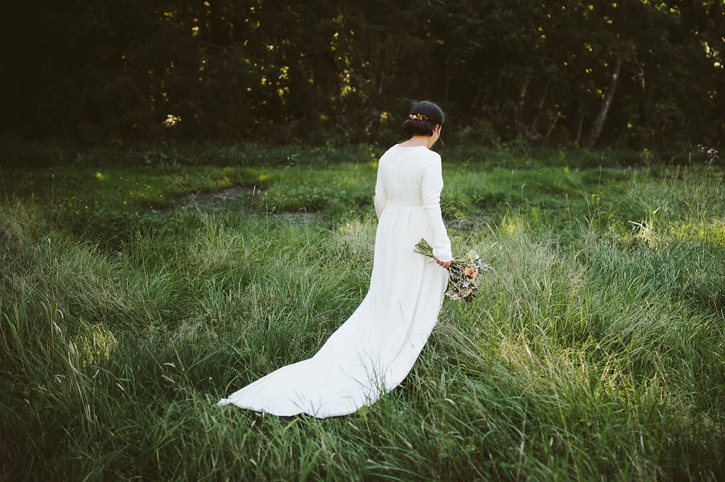 “Jag hade en guldaccessoar från The Wild Rose i håret och Marlene hade ordnat en väldigt enkel och klassisk uppsättning där spännet fick ta plats. Min klänning hade jag sytt upp hos en skräddare i Shanghai under våren när jag bodde där. Min vän Nathalie stod för det mesta av designen. Man kan säga att hon översatte min ide till verklighet. Den är helt i silke och har ett långt släp. Rund hals och skuren i midjan. Lite, lite för långa trumpetärmar och en hög slits på vänster sida som bara syntes när jag gick. Klänningen hade råa kanter, alltså inga sömmar i slutet av styckena. Kinesiskorna som sydde den tyckte jag var alldeles för galen som visade så mycket hud (slitsen) och borde absolut sy dit ett helt gäng med paljetter. När jag berättade att jag skulle vara barfota på vigseln höll de på att ramla av stolen. ‘’You are crazy miss’’!”
