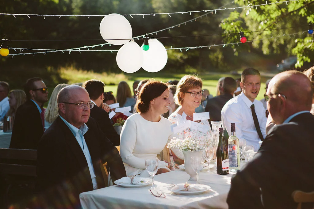 “Tal på både svenska och kinesiska blandades med sånger och spex från våra vänner och tiden under middagen bara rusade förbi. Ungar lekte i gräset, kompisar höll show vid sina bord, och Veronica och Martin skickades runt i olika lekar när middagen övergick till efterrätt. När Håkan Hellströms “Mitt Gullbergs kaj paradis” plötsligt dånade ur högtalarna - vår favoritlåt, kunde vi inte låta bli och en spontan, lite annorlunda bröllopsvals tog fart. Vi hade inte planerat någon dans men kunde liksom inte låta bli. Glädjen över den här dagen, all kärlek och vår favvo-låt! När låten närmade sig sitt slut kom servitriserna bärandes på mormor Inga-britts hembakade tårta serverad på en 2 meter lång trästock och vilken succé. Tårtan tog slut i ett nafs!”