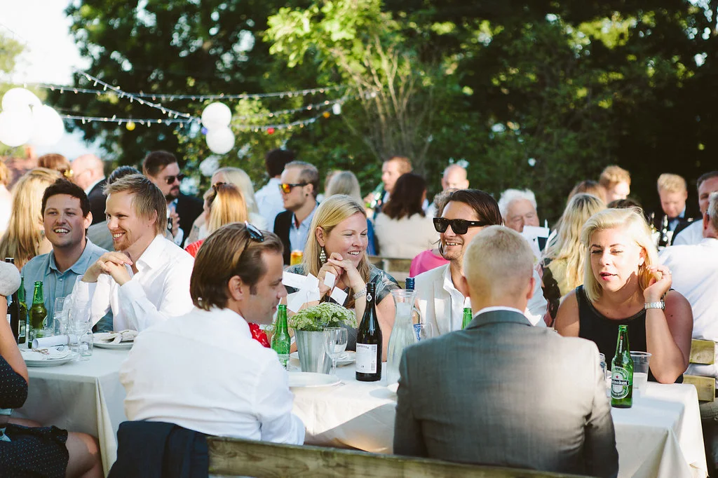 Vid fem-tiden tändes grillen och gästerna rullade in en efter en. Vissa hade vi inte sett på länge, vi bodde två år i Kina fram tills sommaren 2015, så det blev kramkalas och re-catch för fullt. Vissa gäster hade åkt hela vägen från Hongkong, Shanghai och Bergen för att ta sig till vår fest, jetlag till trots gav dom sig ner mot grillarna. Vid sju-tiden var det sagt att brännbollsturneringen skulle äga rum och alla hade då anlänt och fått i sig lite korvar och några kalla öl. Vissa hade till och med fiskat och lagt det på grillen (lillasyster Nikki fick lära grabbarna hur man rensade fisken). Medan solen sakta gick ner pågick turneringen mellan alla gäster med spontant uppdelade lag med den klassiska ett, två, ett, två metoden från gympan i skolan ni vet, och när det vinnande laget (brudens såklart!) firat klart och avbrutna lösnaglar i motståndarlaget sörjts övergick det hela till en fest under stjärnorna med bastubad och ett nattdopp som avslut. Vissa gick och la sig med motiveringen: - ‘’Det är en lång dag imorgon och jag behöver min skönhetsömn’’, medan andra (läs brud och brudgum) stannade uppe alldeles för länge tillsammans med ett gäng festsugna vänner. ”