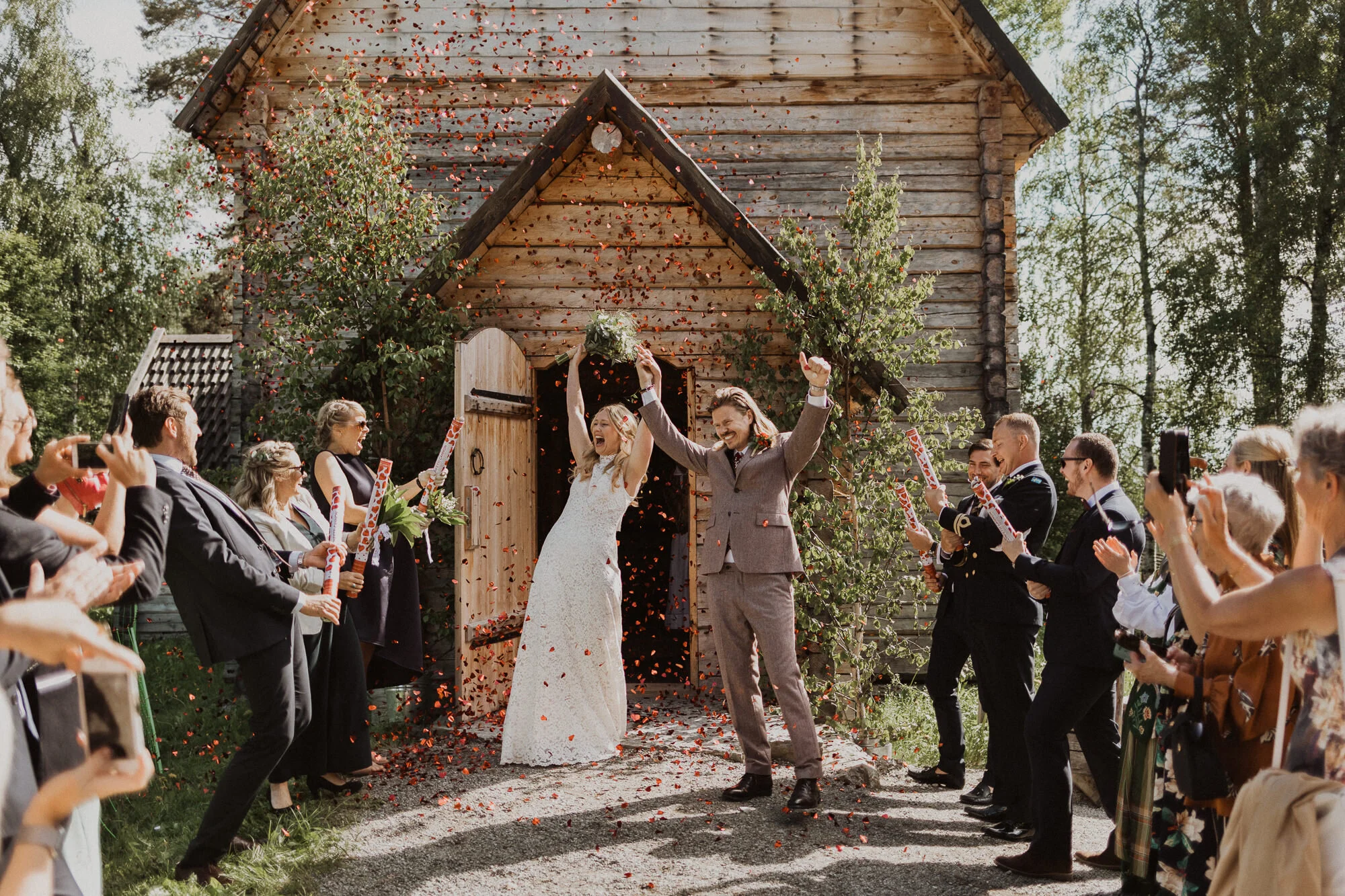Efter vigseln är det riktigt härligt med konfettikanoner. Just på detta bröllop nedan visste inte brudparet om att deras gäster skulle ta emot dem så utanför kyrkan, vilket ju såklart gjorde det hela ännu roligare. Men även om man vet om det så är det en rätt härlig känsla! (Kolla dock med kyrkan eller vigselplatsen att det är okej och se om ni kan hitta konfetti som förmultnar av sig själv för att vara lite snäll mot miljön).