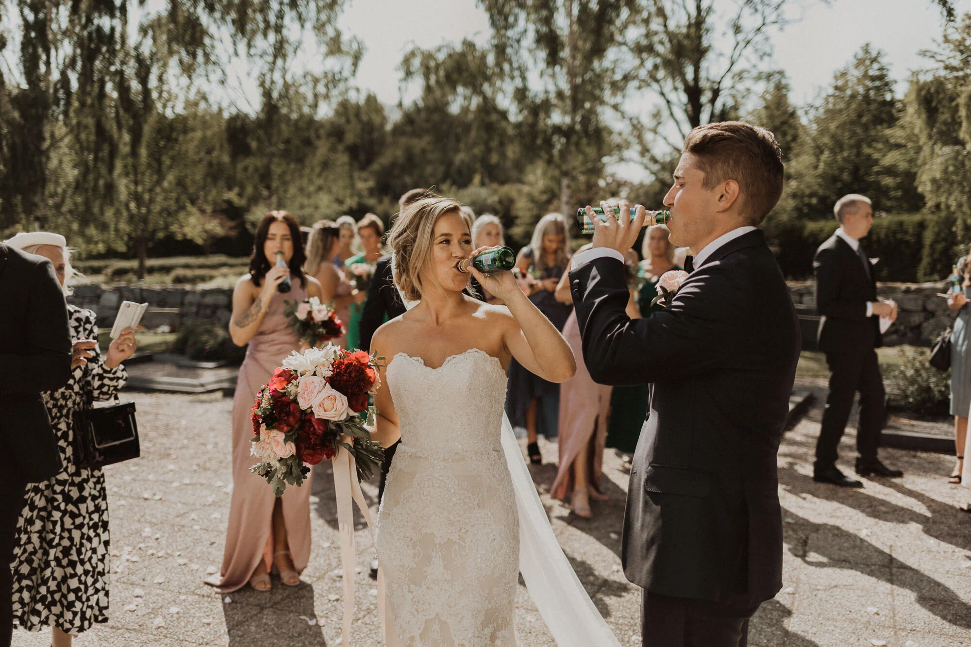 Börja festen redan direkt efter vigseln. Dela ut små bubbelflaskor till alla gäster så vet dem att nu börjar firandet på riktigt! Ännu bättre om det är gångavstånd mellan vigsel och fest eller om ni kan ordna med gemensam skjuts för alla gäster (t ex buss, släpvagn, studentflak eller något att skoj).