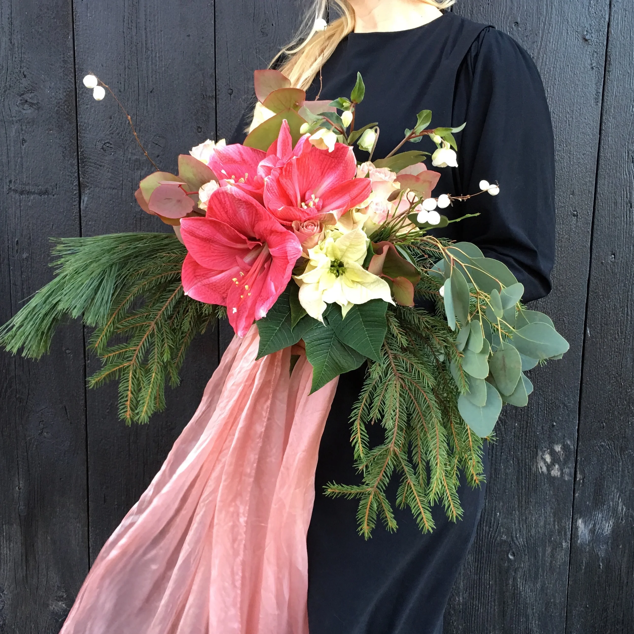 Vintern vackraste kan jag tycka är amaryllis som är så oerhört mäktig i sin form och storlek att den talar för sig själv. Den finns i många olika färger från djuptös-röd, randig, aprikos, rosa-vitt. Personligen arbetar jag helst med väldigt många olika växter i en och samma bukett. Jag vill ha olika element med väldigt olika former för att bygga upp dynamiken i buketten.