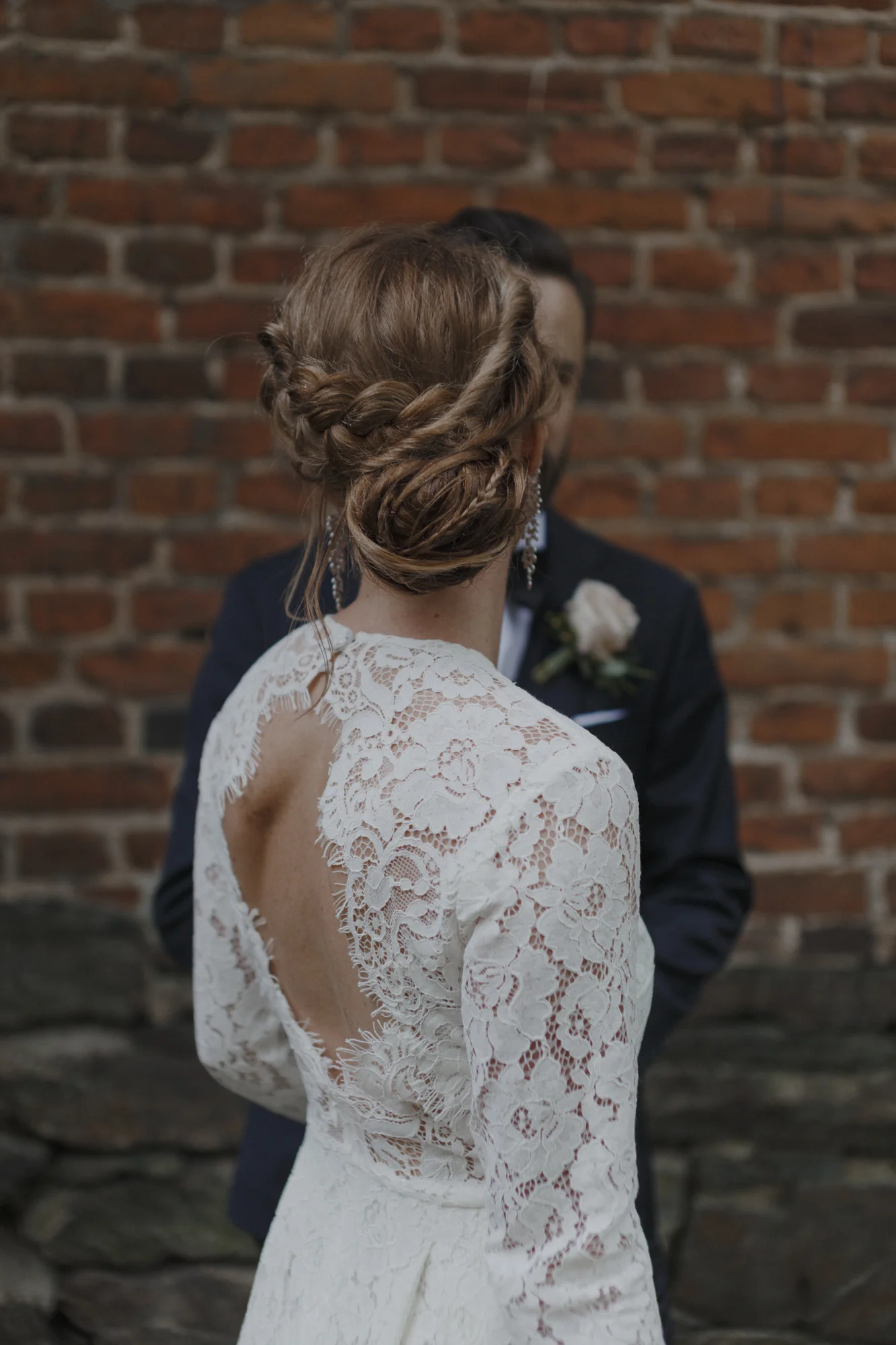 Att ha ett färgkodat bröllopstema var egentligen inte viktigt för oss utan vi letade efter kläder och detaljer som vi tyckte om och som vi kände var "vi". Jag hade en ganska klar bild över vad jag ville ha för klänning, enkel och i spets och jag behövde egentligen inte leta särskilt länge innan jag hittade min från Ivy & Oak. Den gav precis den lite höstiga avslappnade känslan som jag var ute efter men hade ändå vackra detaljer som tex en öppen rygg.