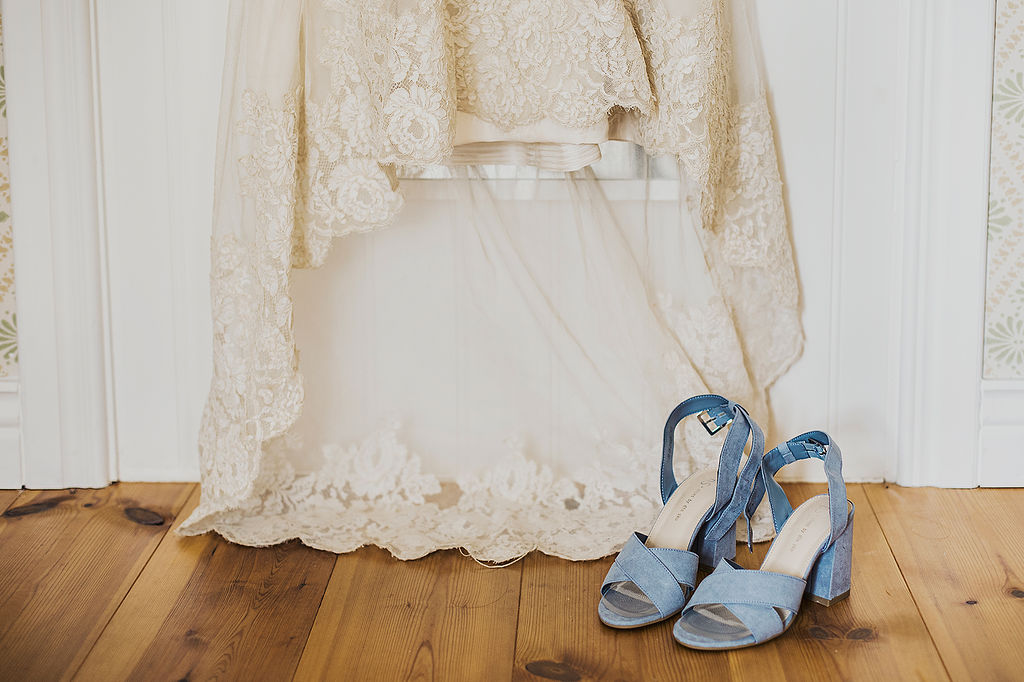Sara: Jag fick håret och sminket gjort av en kompis. Vi testade flera gånger för att hitta vad jag gillade, för jag hade inte så tydliga idéer mer än att jag ville ha det enkelt. Jag hade blåa sandaletter till brudklänningen för jag tyckte det var kul att knyta ihop det med Christophers blå kostym. Christopher bar ett par svarta longwings från Alden och en Omega-klocka från 70-talet som han älskar och använder även fast den inte slår.