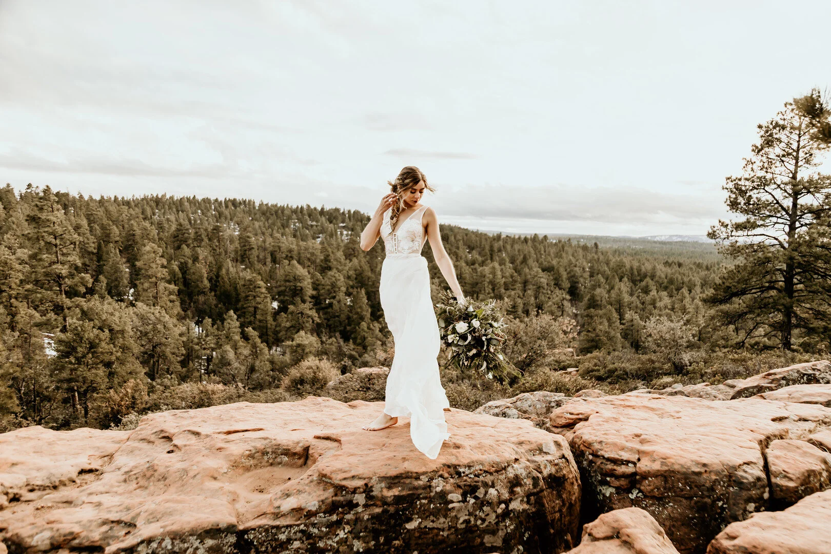 Fotografen Melissa Fe Chapman Photography tar med oss ut i skogen för att tillsammans med andra leverantörer inspirera till ett riktigt fint vinterbröllop. Färgsättningen och känslan i bilderna får oss att direkt tänka på julens mysiga stämning, även om bilderna också visar att det kan inspirera till ett vinterbröllop rent generellt. Men medan en färgpalett i rött och grönt ofta blir ganska tröttsamma när julen väl är över, känns den här stylade fotograferingen som ett elopement som faktiskt håller stilen mycket längre än så! De juliga tonerna och detaljerade dekorationerna mixas med mer stilrena texturer och material som lättar upp den intensiva röda tonen en hel del.