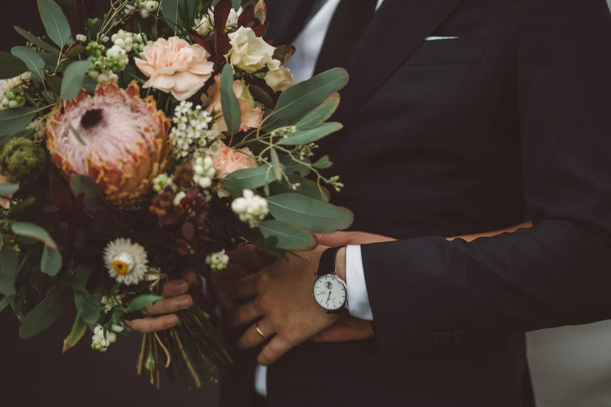 Emma: Min brudbukett, tärnbukett och övrig blomsterdekoration anlitade vi Korsbackens blommor i Simrishamn för. Vi hade ett kort möte med dem före bröllopet där jag visade ett par inspirationsbilder på hur jag ville att min bukett skulle se ut och sen gav jag dem helt fria händer att skapa något som passade. Och som de infriade mina ganska höga förväntningar! Så duktiga och de förstod precis vad det var jag ville ha.