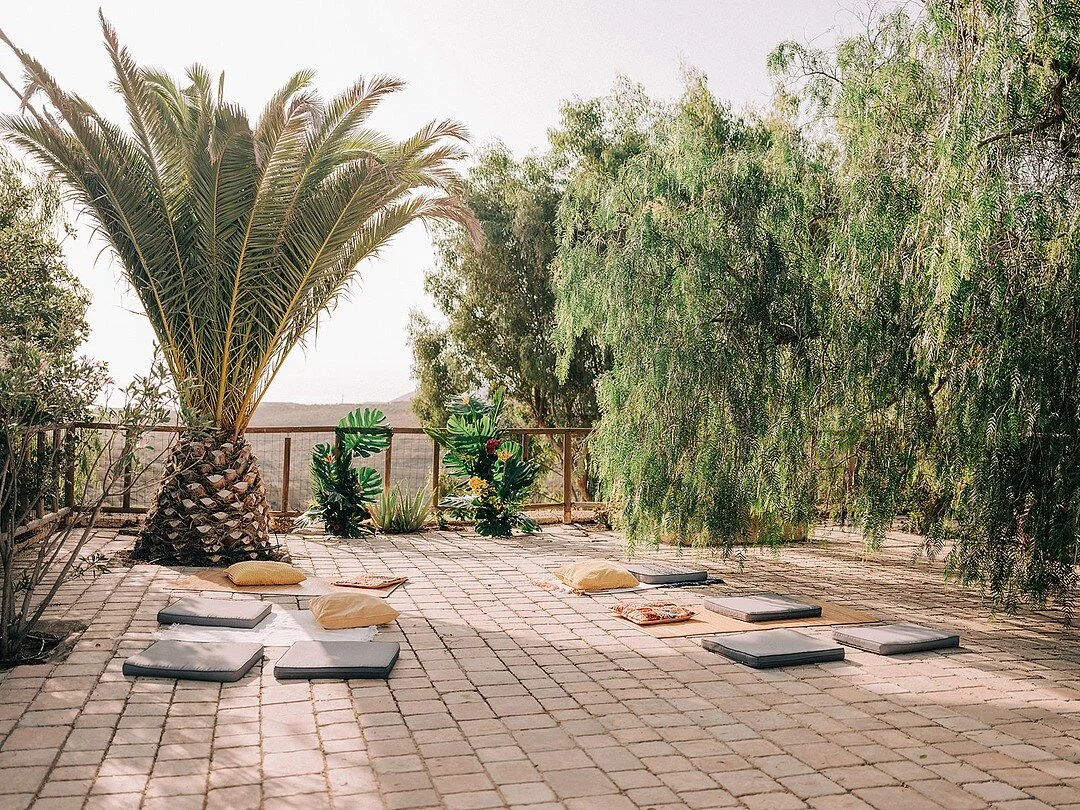 Även då paletten är väldigt vibrant och tar mycket plats, så gör inte vigselplatsen det. Här hittar vi en lugn oas med mycket grönska och naturliga växter. Sittplatserna är gjorda av kuddar på marken och det naturliga ljuset är den enda ljuskällan. Här kan vi tänka oss att en lugn och intim ceremoni tar plats, där känslorna och orden står i fokus.