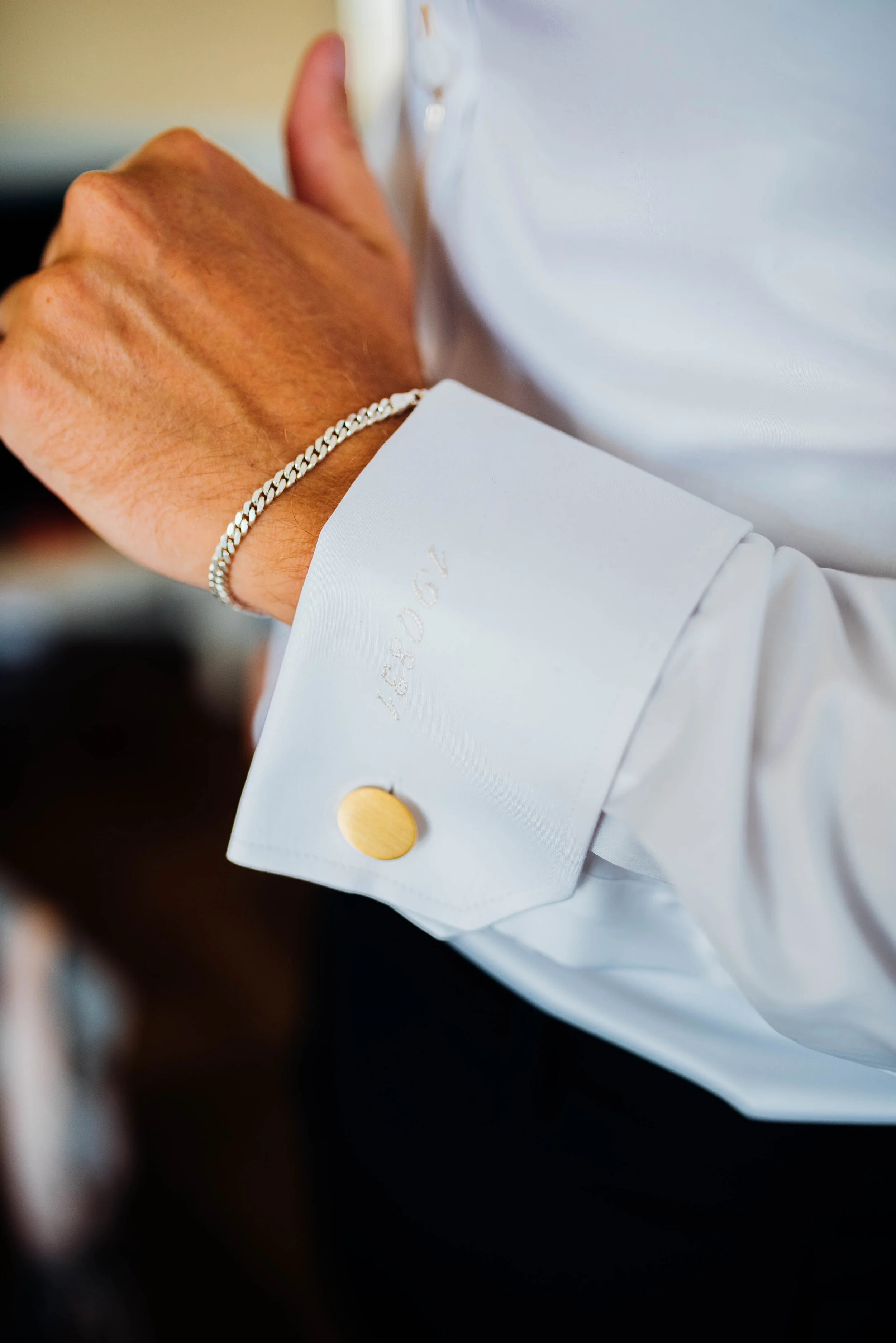 David var direkt inne på att ha en svart kostym, så därifrån gick det ganska så snabbt att välja. Det var viktigt att kostymen hade en fin lyster, för att ge ett mer elegant intryck. Vit skjorta till och även där ute efter en fin lyster. Som en fin detalj på manschetten broderade David även in bröllopsdagens datum som en överraskning. Till detta valdes en lite festlig slips i silver med subtila mönster. Svart kostym innebar även svarta finskor och som sista detalj på helheten matchande manschettknappar och slipsnål i guld.