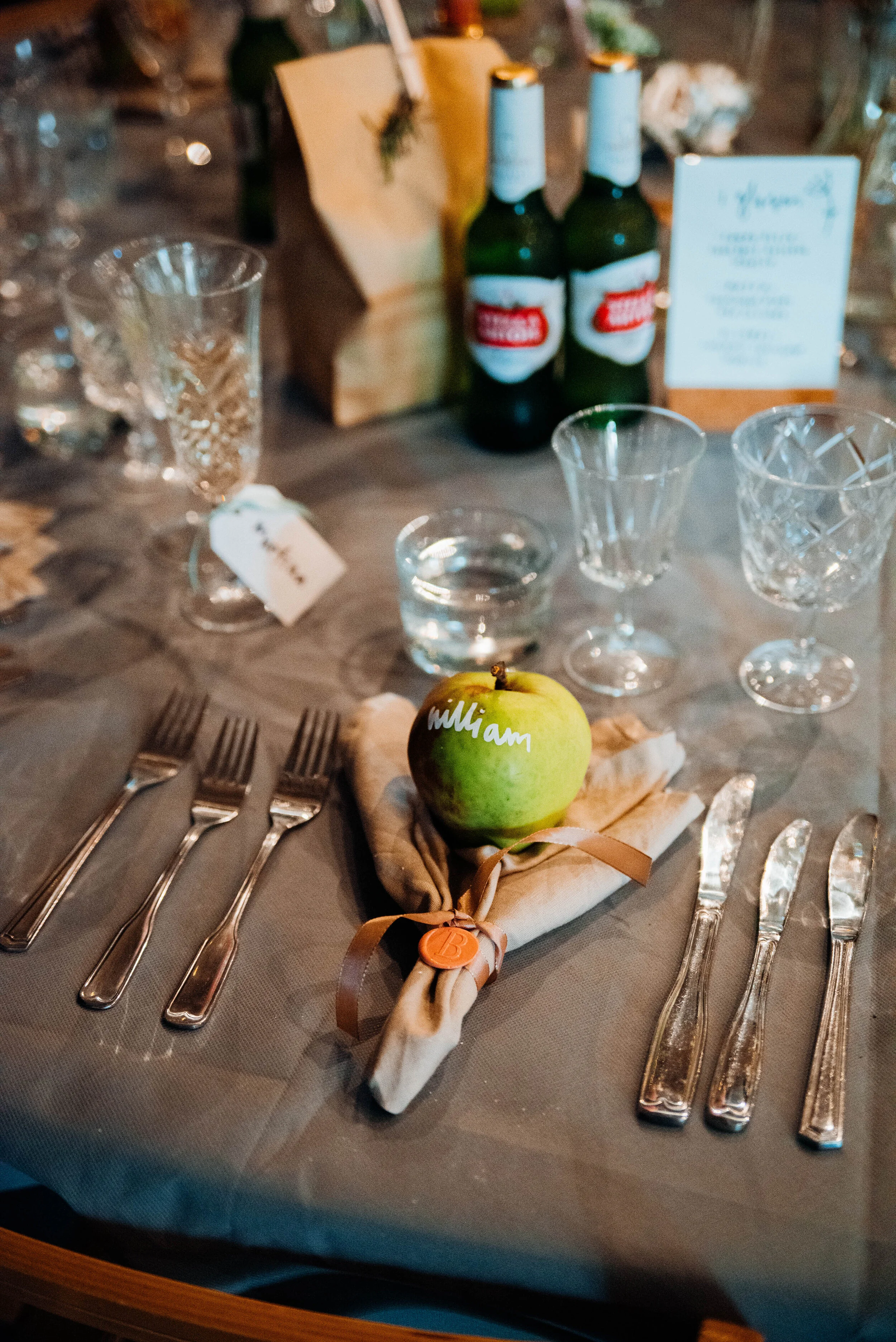Elaine: Gammalt möter nytt. Den råa ladan gjorde att mina idéer tog fart direkt när vi besökte Lindäng för första gången – att faktiskt få bestämma och forma platsen för vårt bröllop helt själva. Allt porslin och glas samlade vi ihop under 1.5 års tid, från olika loppisar. Som plus i kanten så hittade jag väldigt fint porslin hemma hos mormor och morfar med. Det blev till slut en väldigt fin blandning mellan gammalt udda tillsammans med Orrefors och Röstrand.