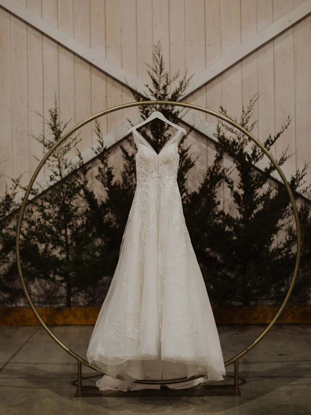 Brudens klänning från Stephanie's Bridal Boutique är slående snygg! En klänning i jungfrustil med långt släp och detaljer från topp till tå. Lägg märke till de vackert placerade knapparna som går från början av kjolen till slutet av släpet, en detalj som gör just den här klänningen unik i sitt utseende.