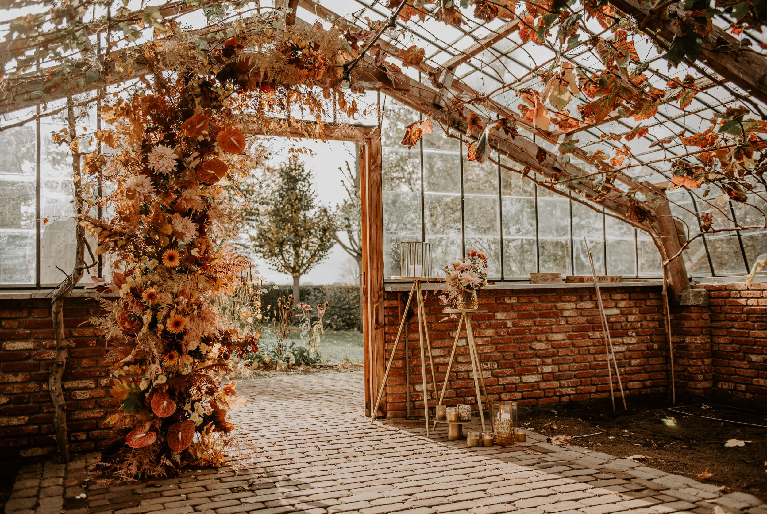 För faktum är att höstbröllop i växthus är så vackert! De gyllene färgerna sätter ton på växthuset och ger det en helt annan känsla än sommarbröllopen. Medan växthusbröllop på sommaren är lummiga och ofta drar i olika färgpaletter, spricker höstbröllopen upp med en helt ny känsla. Det blir mustigt, mysigt och en dröm för er som vill dekorera med en orange färgpalett. Kanske drömmer ni just nu om ett höstbröllop utomhus men känner er lite tveksamma till regn och rusk som snabbt kan krypa sig på? Då borde ni kolla in bilderna från den här fotograferingen med Demi's Disign bakom kameran.