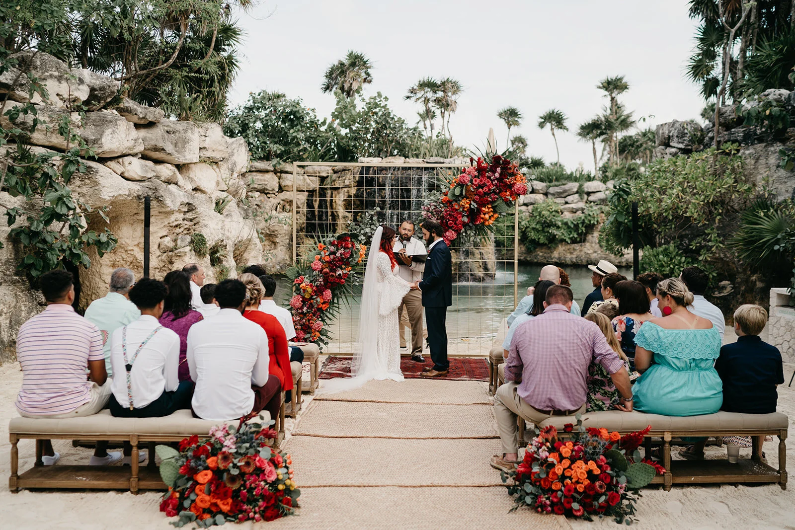 Vilken vigselplats! Den lilla stranden leder ut till klarblått vatten och fantastiska klippor i bakgrunden ramar in det hela. Inför ceremonin har brudparet valt att dekorera platsen med naturnära färger på möblerna och färgsprakande blomsterarrangemang i rött och orange.