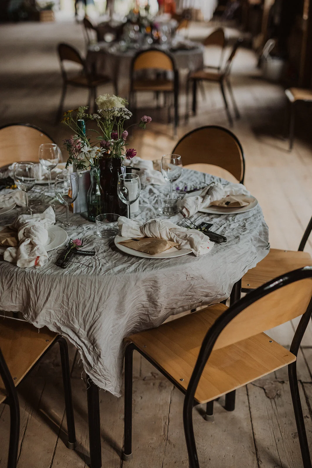 Dukningen skulle likt resten av bröllopet inte vara för tillrättalagd. Med skrynkliga linnedukar, udda loppisfyndade bruna flaskor med ängsblommor i och små godispåsar på varje plats med brudparets favoriter blev det så bohemiskt och personligt som vi önskade.