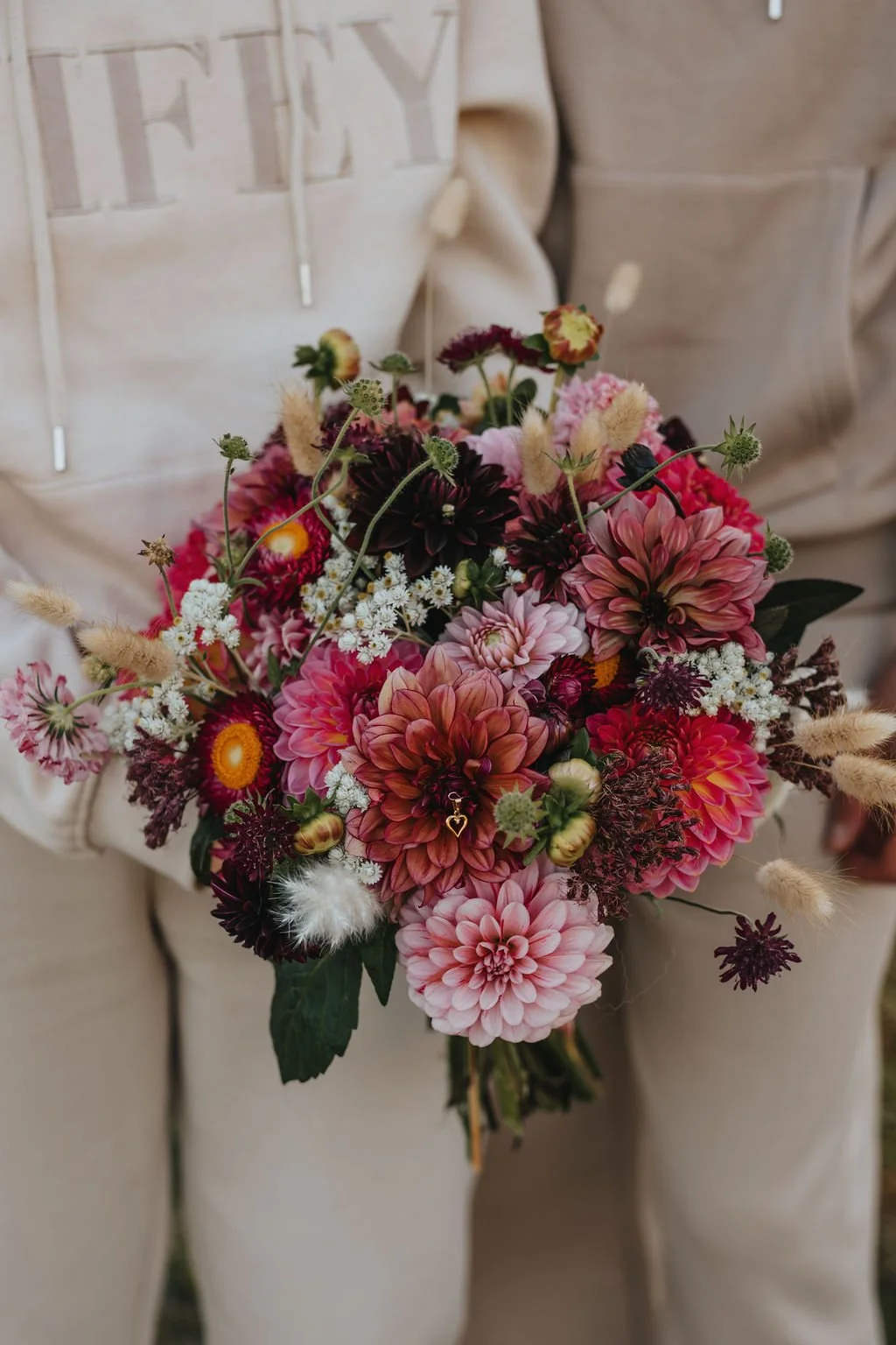 MALIN: Jag och min tärna är utbildade florister så det var alltid självklart att vi skulle göra alla buketter och blomsterdekor själva. För att komma ner lite i blompris så plockade vi alla blommor själva till bröllopet på självplock hos Solbackens Småbruk. Alla blommor gick i en höstskala från rost-mörklila. Främst använde vi dahlior som är i säsong i september, så stor och finblomma där man får mycket färg per blomma. Året innan så åkte jag till samma självplock och plockade blommor till min egen brudbukett inför vigseln, så det blev också en fin röd tråd.