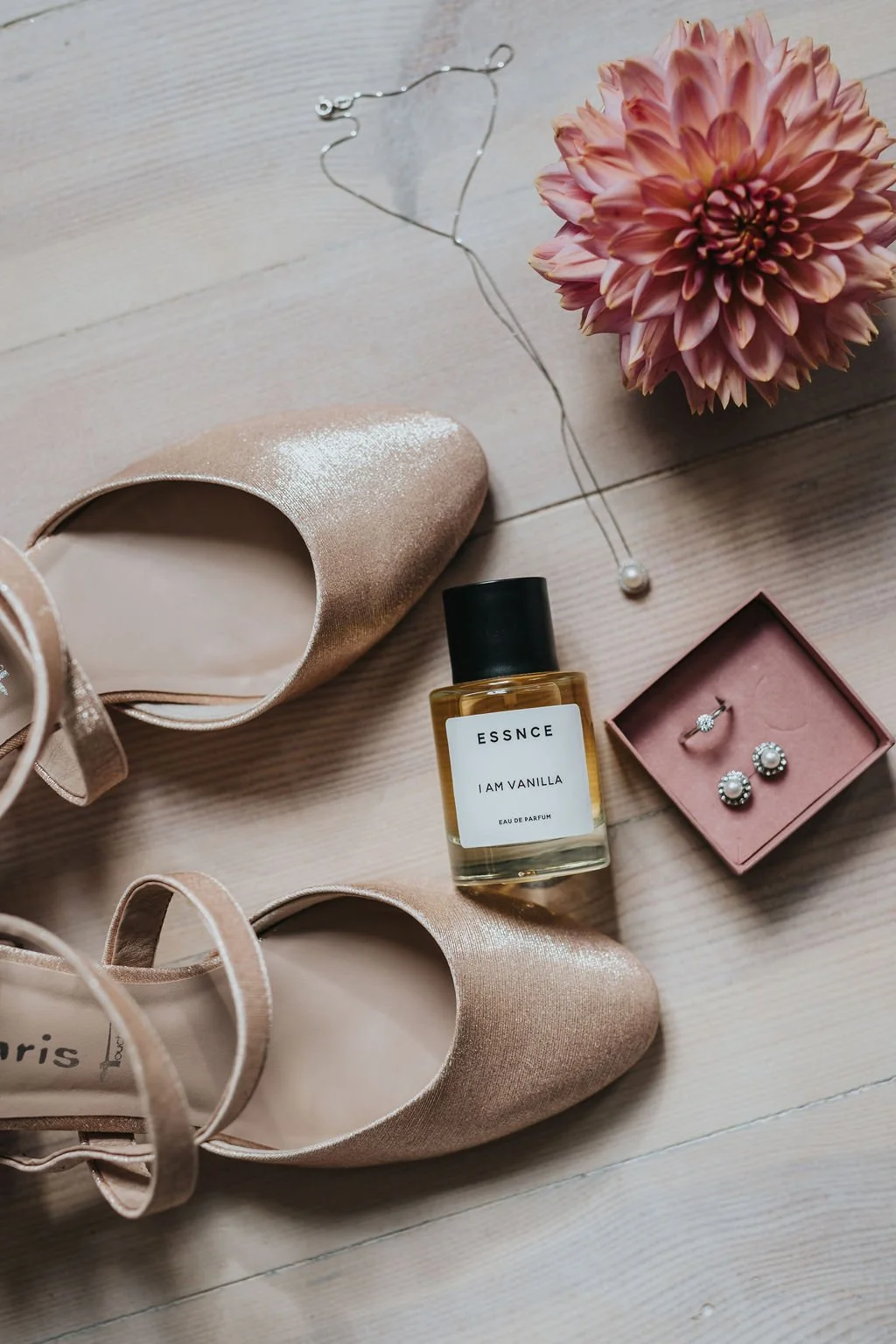 MALIN: Jag hade ett halsband som jag fått av Filip på en tidigare årsdag, sen köpte jag matchande örhängen och armband. Skor letade jag ganska länge efter. Undertonen i min klänning var lite åt rosépeach hållet och jag lyckades faktiskt hitta glittriga skor i exakt samma nyans. Så piffigt att både mina skor och min klänning glittrade i samma nyans!
