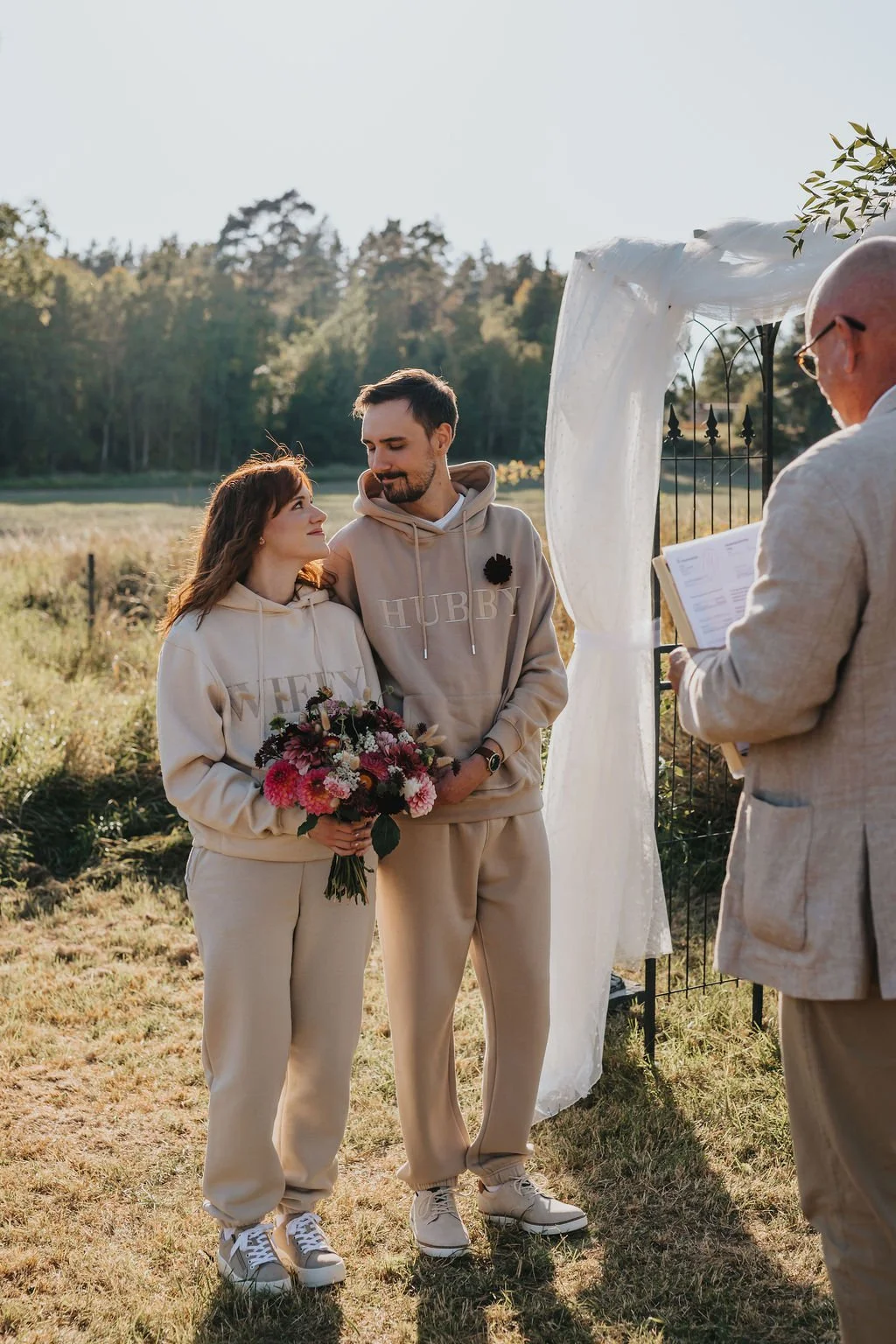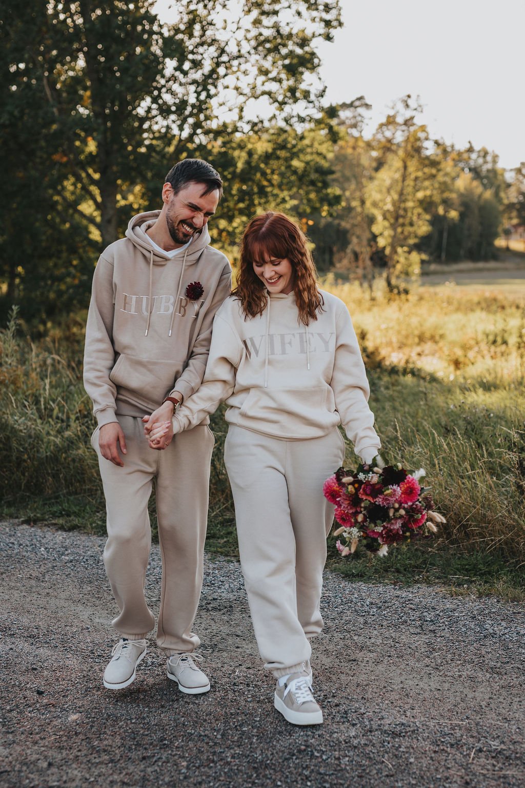 Med tanke på att vi ser vigseln som så personlig och intim så resonerade vi fram att det vore väldigt självklart att gifta sig i myskläder, så som vi oftast ser varandra hemma haha. Jag beställde hem matchade "hubby - wifey" mysset från Six stories. Inte trodde man att man skulle gifta sig i myskläder, men så rätt det kändes! Sen höll vi vigseln hemlig för våra gäster för att kunna göra ett fint reveal på själva bröllopsmiddagen. Inte det lättaste att dölja att man varit gift i ett år, men ändå så var det bara ett fåtal gäster som råkat googla fram sanningen! Sen berättade vi även för brudföljet med tanke på att de skulle vara med oss hela bröllopsdagen och då är det inte praktiskt att de inte skulle veta. Det hela blev väldigt lyckat och kändes väldigt Oss.