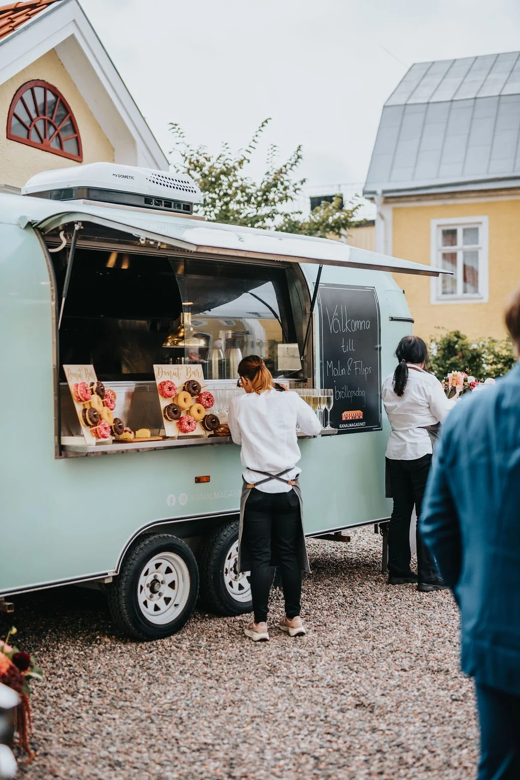 Mat och dryck var något vi absolut prioriterade högt då vi båda älskar mat! Vi valde att ta maten från Kanalmagasinet (ännu en röd tråd!) och vi använde deras mintgröna foodtruck som gjorde sig galet charmig på innergården. Menyn satte vi helt själva tillsammans med dem och vi blev oerhört nöjda. Vi tog inspiration från våra favorit kulturer japan och Italien när vi satte både mat och dryck. Till vickning serverades lyxiga cheeseburgare från foodtrucken.