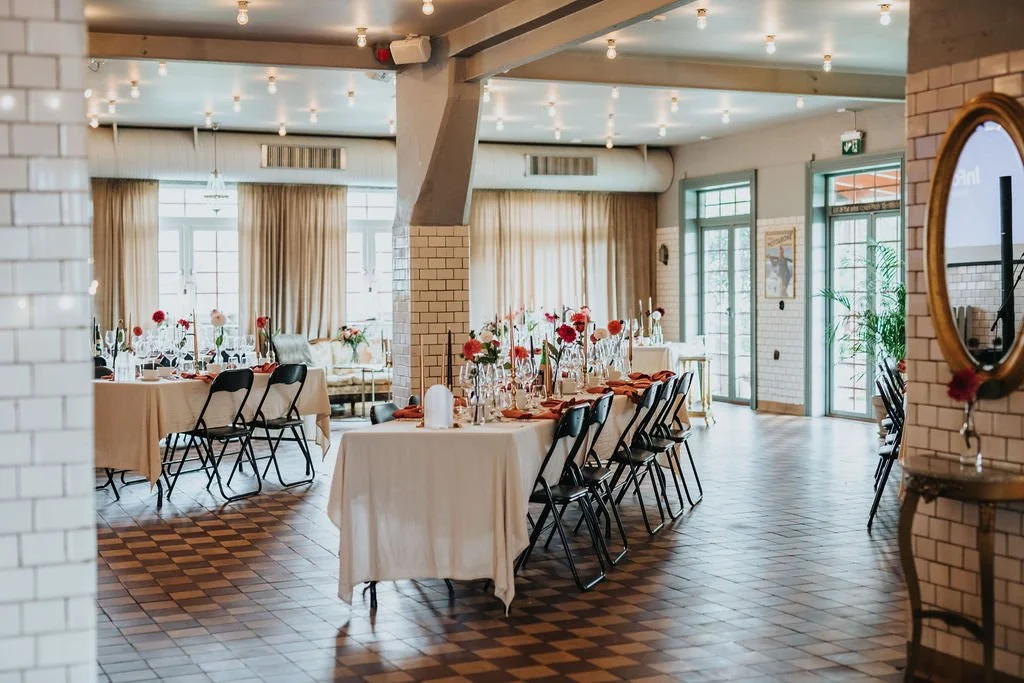 Och vilken tur att vi gjorde det! När vi väl sett lokalen så var valet solklart. Perfekt innergård och trädgård för mingel, huset ser ut som ett vanlig gult hus men när man kommer in så är det en helt annan känsla där kakel och trä möts. Vilket blir en väldigt modern industriell känsla som ändå har en mysig värme, perfekt att dekorera upp lokalen ytterligare med blommor och dekor.