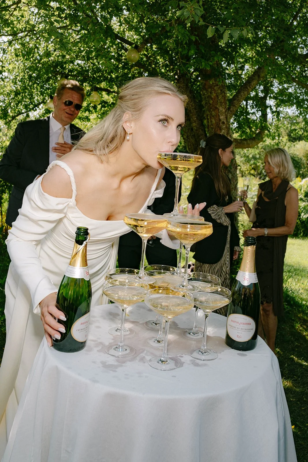 SOFIA: Mina pärlörhängen har jag ärvt från min mormors farmor – de är från 1800-talet och kändes extra betydelsefulla att bära på bröllopsdagen. För att balansera den mer avskalade klänningen valde jag en 3,5 meter lång mantilla-slöja med spetskant. Den kändes dramatisk på ett sätt jag verkligen gillade – precis den kontrast jag var ute efter. Samtidigt fanns det något lite vintage över både spetsen och längden, vilket gjorde att slöjan kändes personlig snarare än traditionell. Det blev ett fint komplement till klänningen, och jag fick så många komplimanger för den.