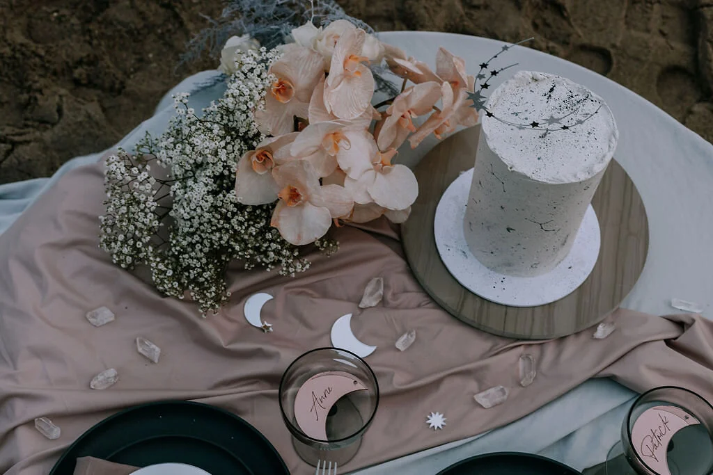 ”I love you to the moon and back”. Vi gillar att föreställa oss hur brudparet på de bilder vi publicerar har formulerat sina löften till varandra. Det stylade elopement vi får ta del av idag hade arbetsnamnet “Mystic Cosmos” och en återkommande detalj är stjärnor och månen som vi ser såväl på bröllopstårtan, som i dukning och i riktigt stort format längre ner i inlägget, fortsätt läsa för att förstå vad vi menar. Leverantörerna bakom dagens plåtning vill inspirera till ett annorlunda strandbröllop, istället för den tropiska touchen som vi vanligtvis förknippar med en strandceremoni för bilderna tankarna till ett romantiskt strandelopement med en mystisk känsla.